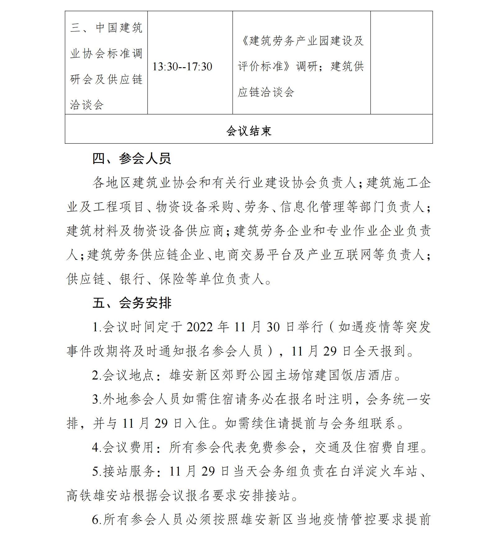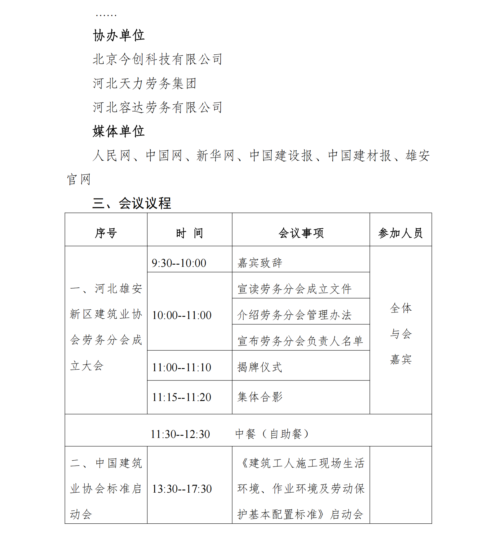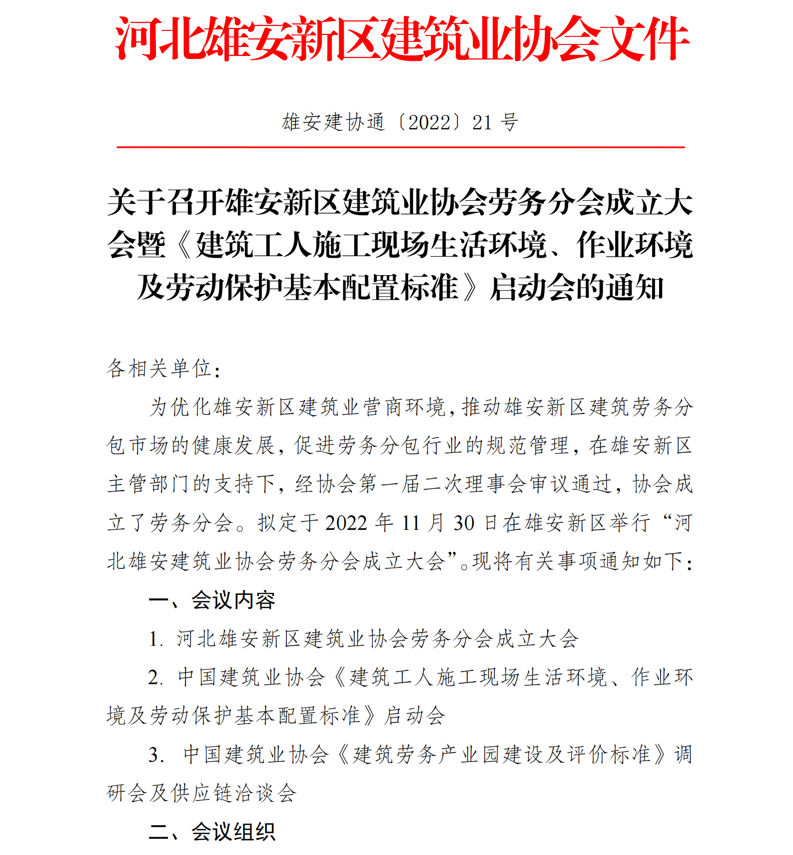关于召开雄安新区建筑业协会劳务分会成立大会暨《建筑工人施工现场生活环境、作业环境及劳动保护基本配置标准》启动会的通知