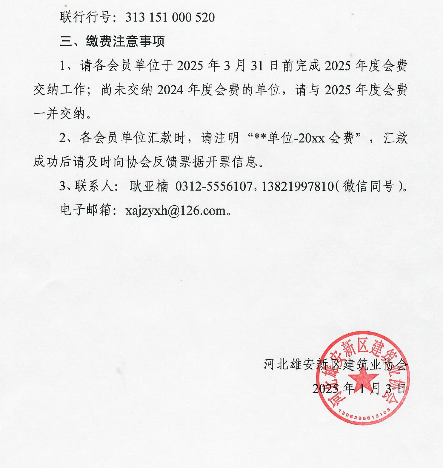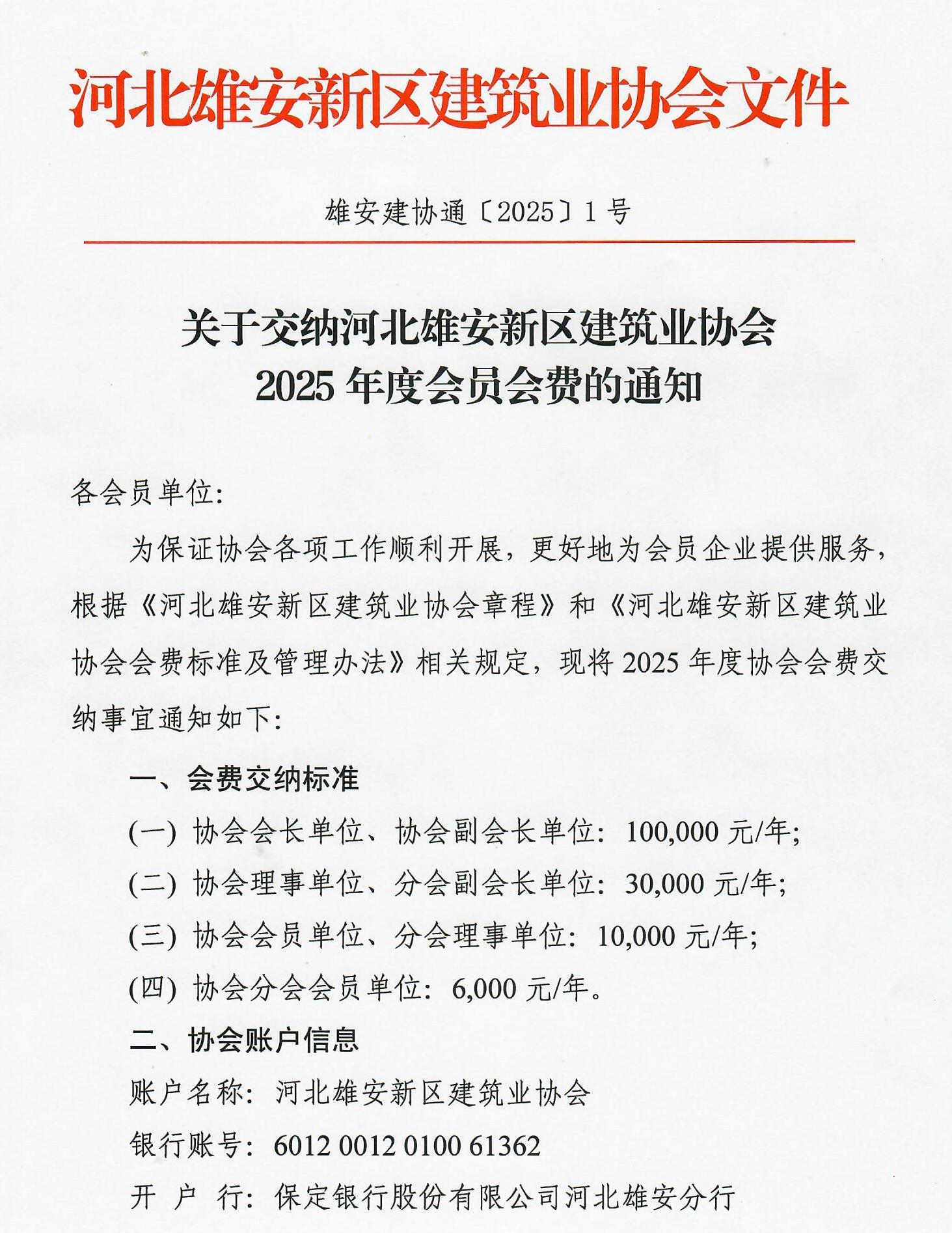 关于交纳河北雄安新区建筑业协会2025年度会员会费的通知