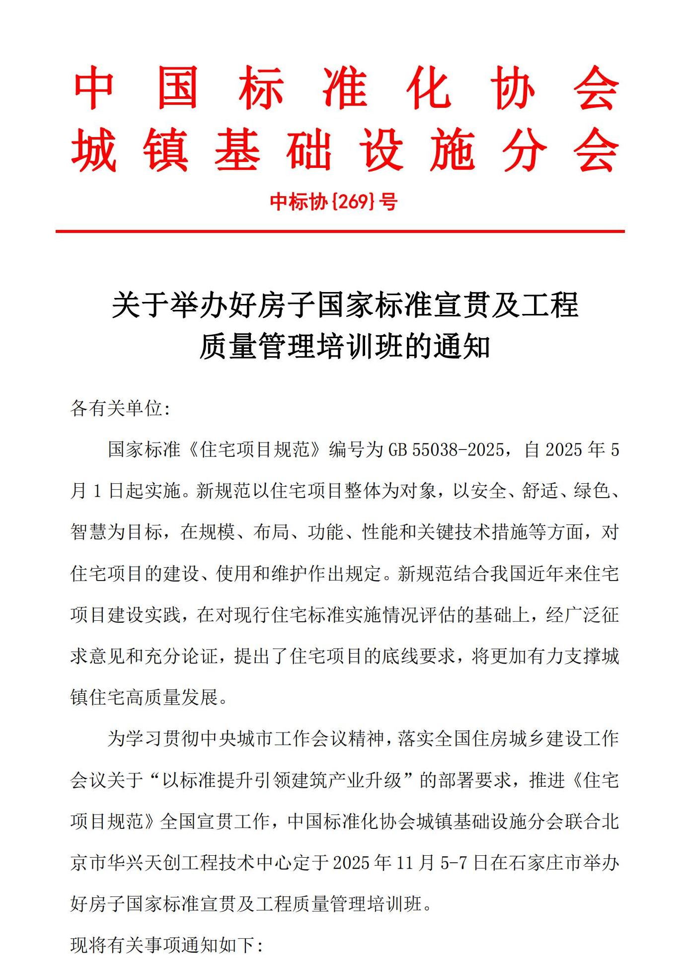 转发中国标准化协会城镇基础设施分会《关于举办好房子国家标准宣贯及工程质量管理培训班的通知》