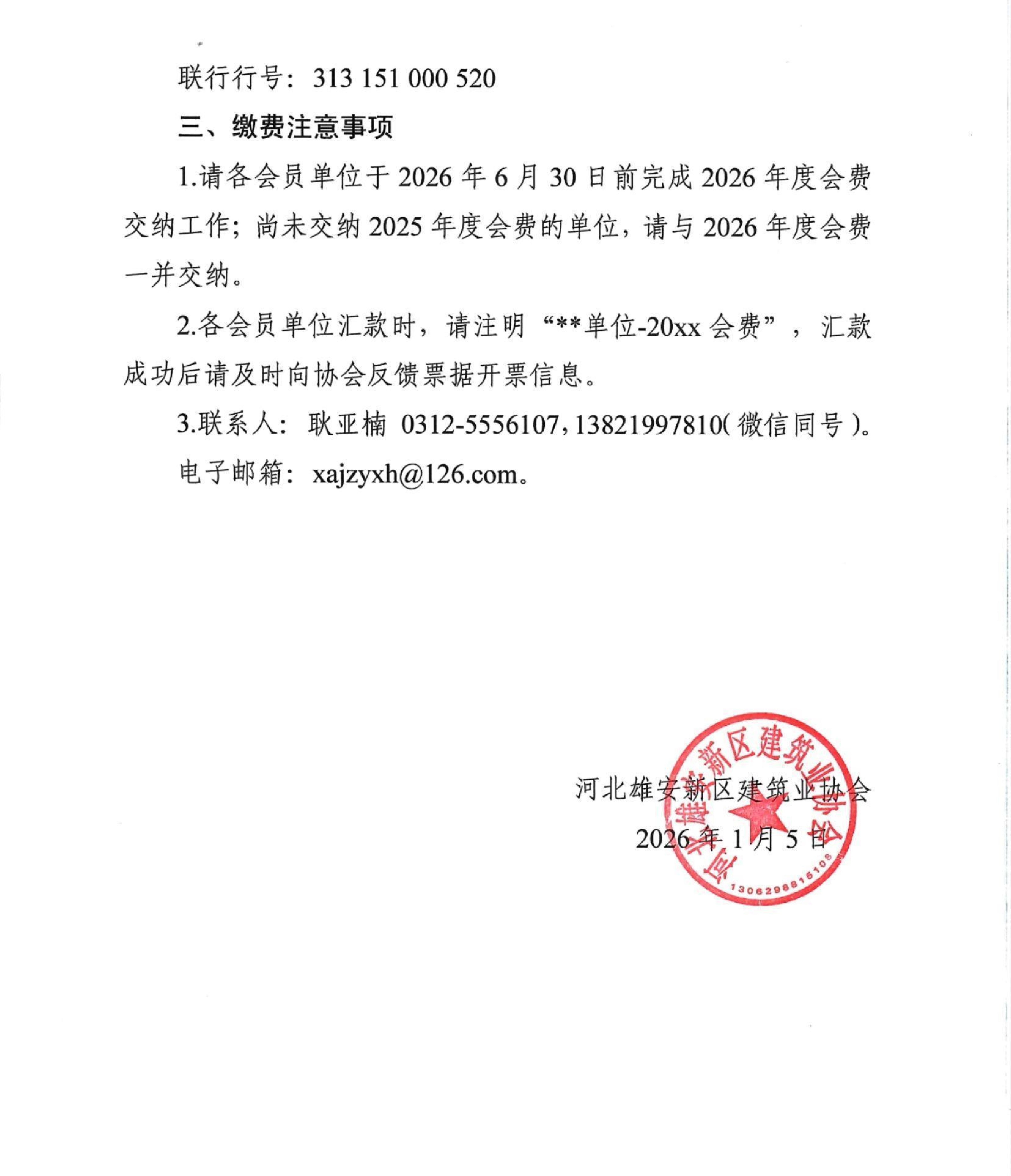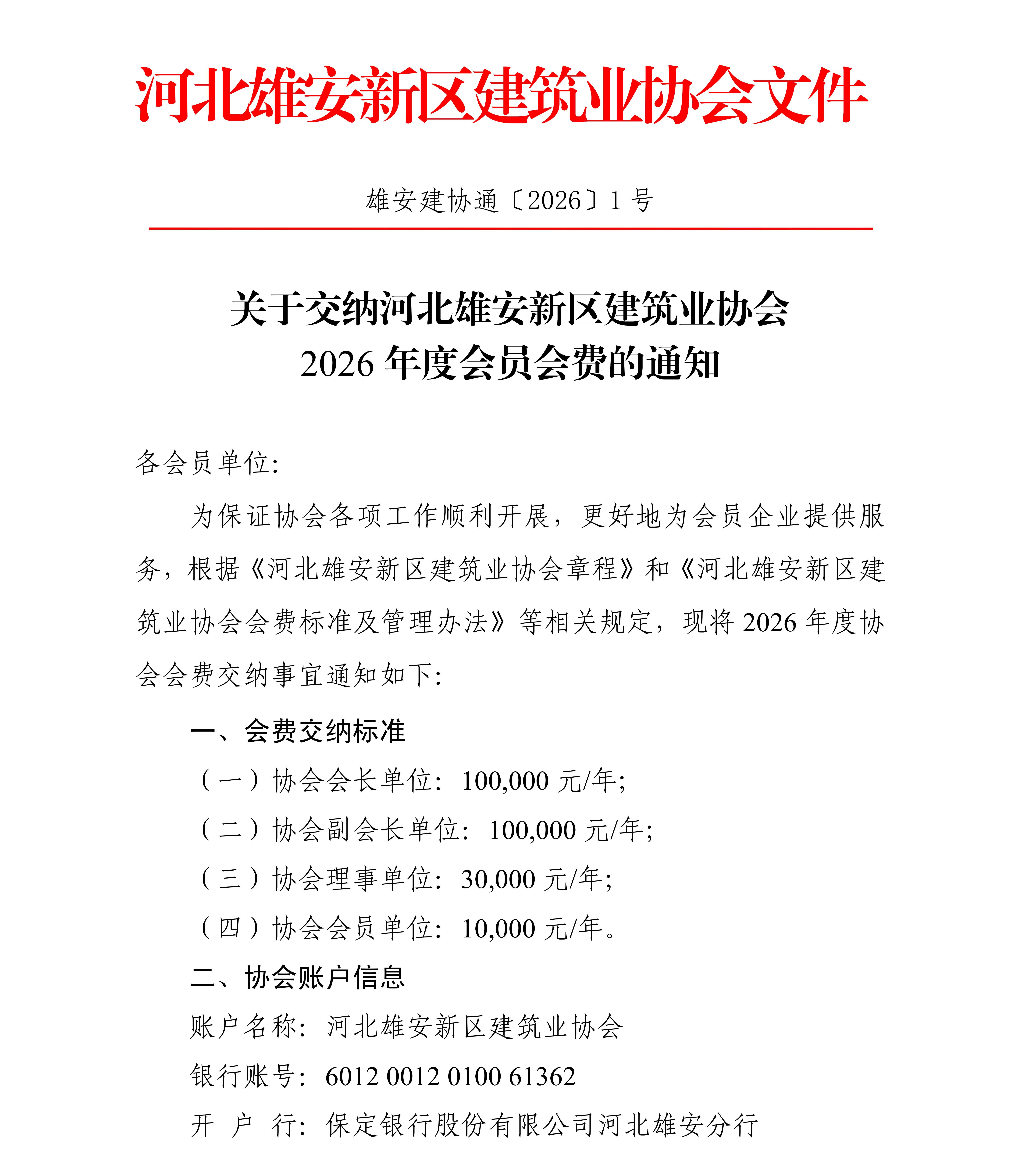 关于交纳河北雄安新区建筑业协会2026年度会员会费的通知