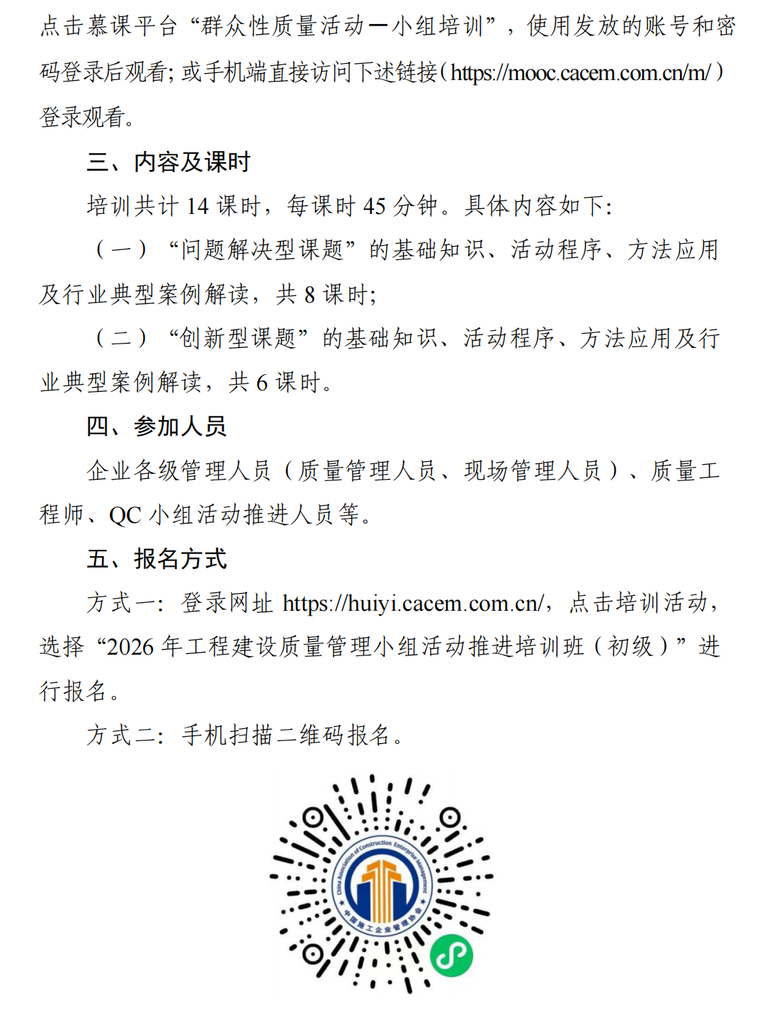 《关于举办2026年工程建设质量管理小组活动推进培训班(初级)的通知》