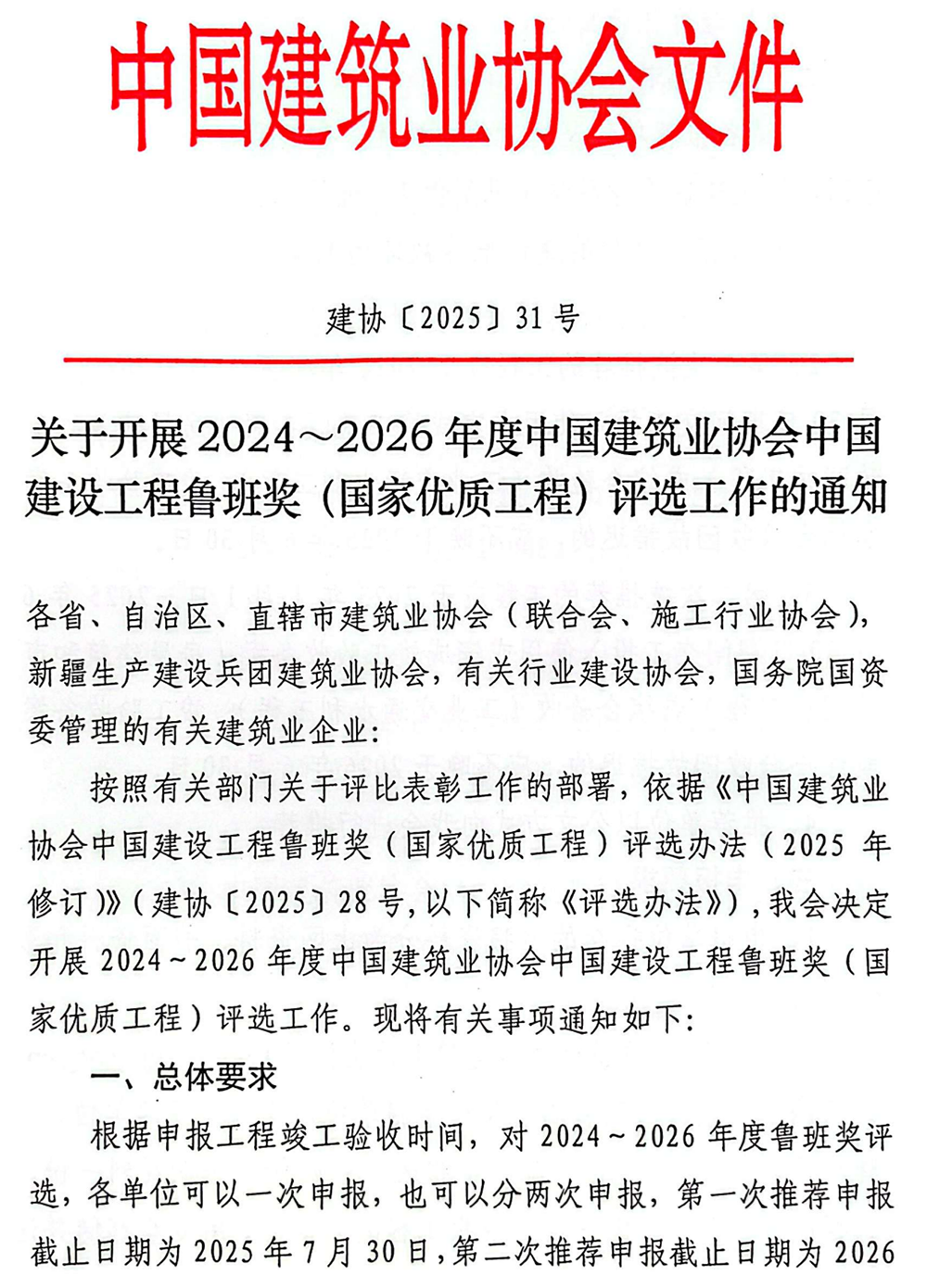 转发中建协《关于开展 2024~2026年度中国建筑业协会中国建设工程鲁班奖(国家优质工程)评选工作的通知》