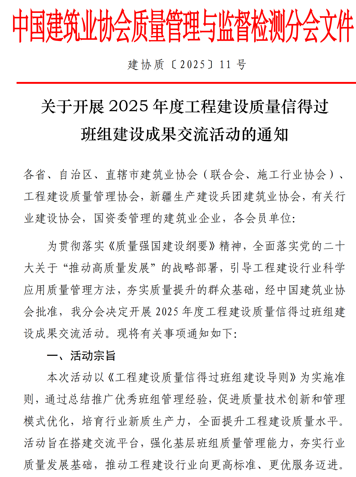 转发中建协《关于开展 2025 年度工程建设质量信得过班组建设成果交流活动的通知》