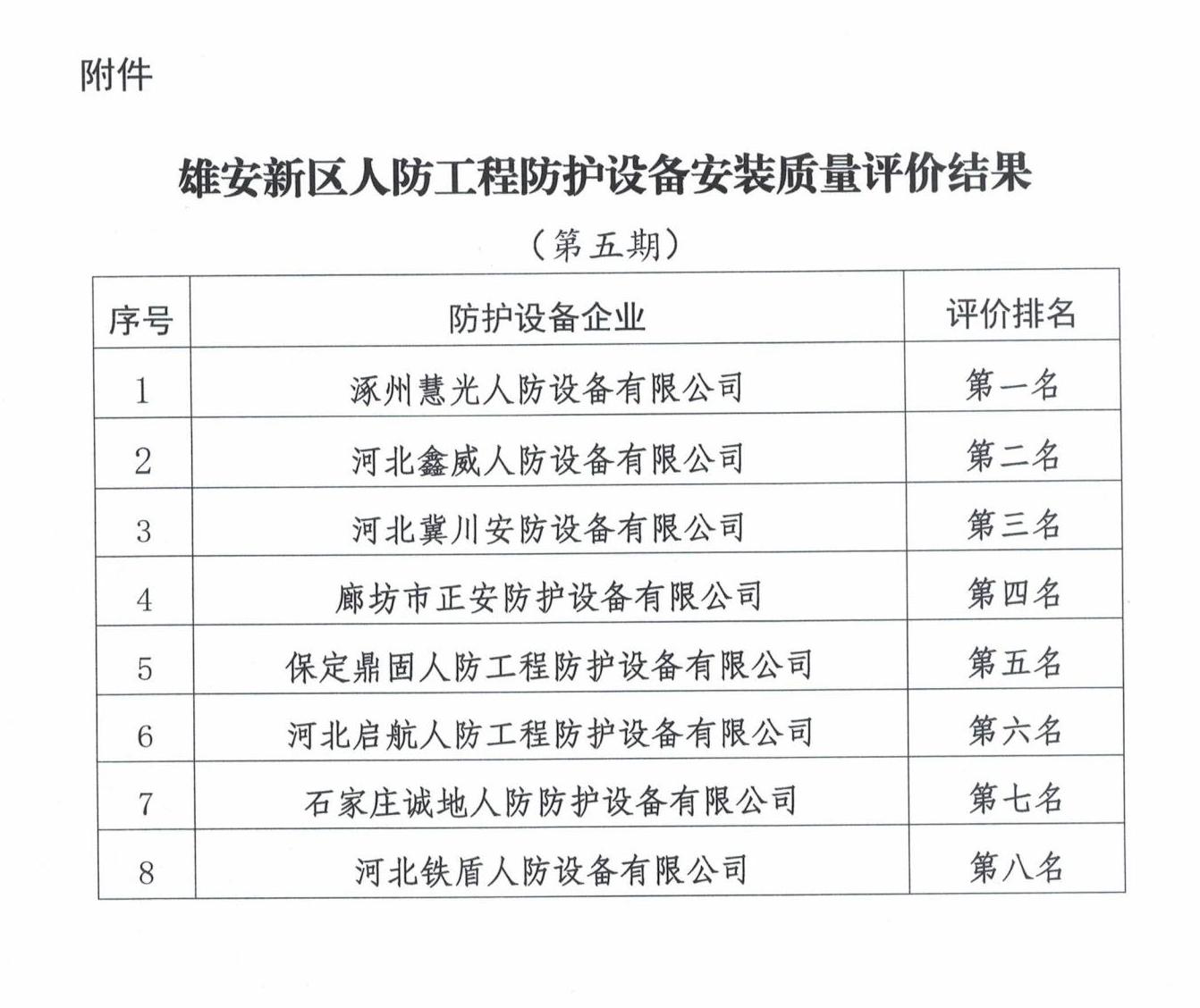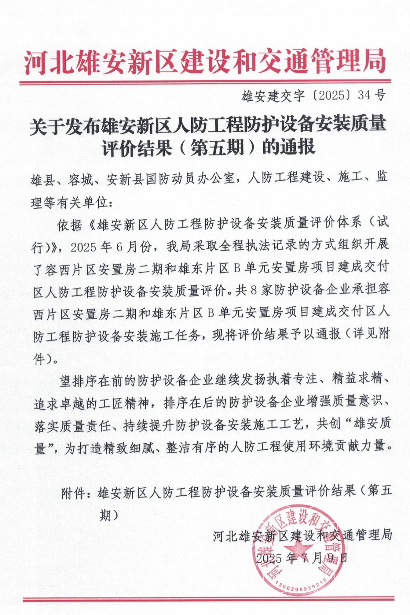 转发建交局《关于发布雄安新区人防工程防护设备安装质量评价结果(第五期)的通报》