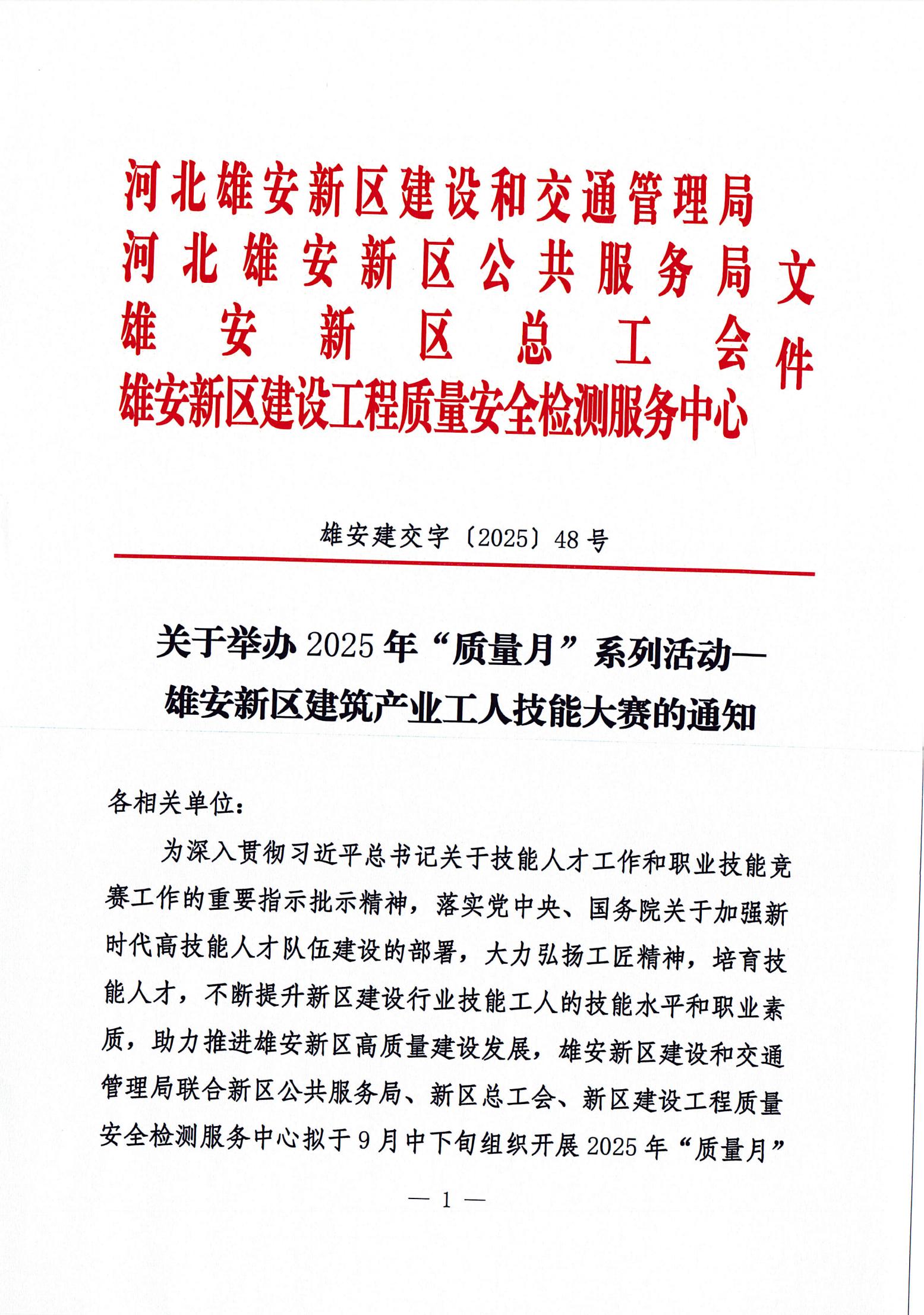关于举办2025年“质量月”系列活动-雄安新区建筑产业工人技能大赛的通知