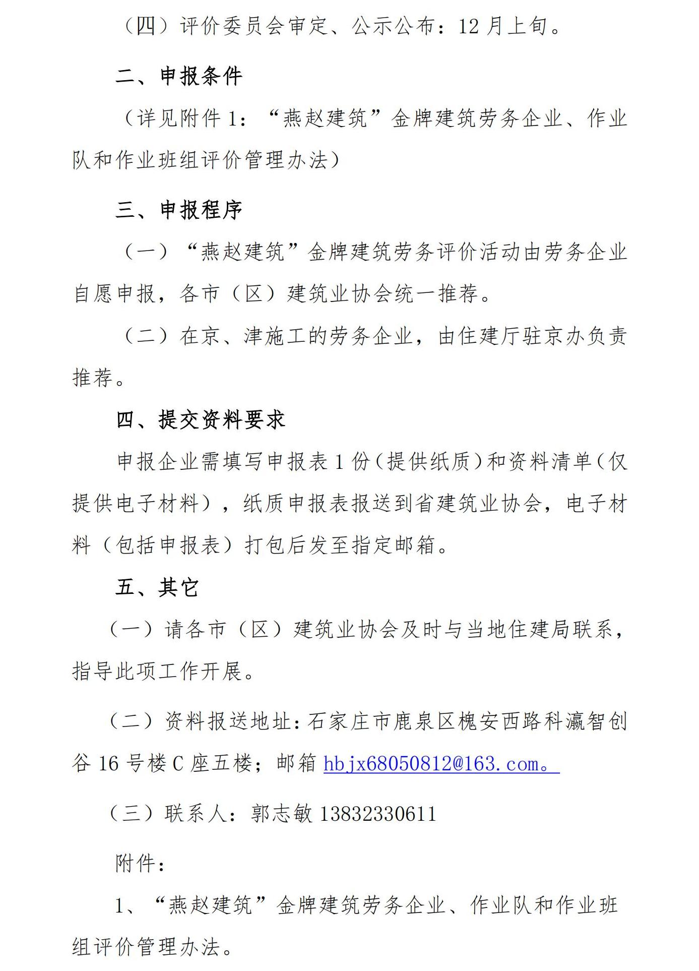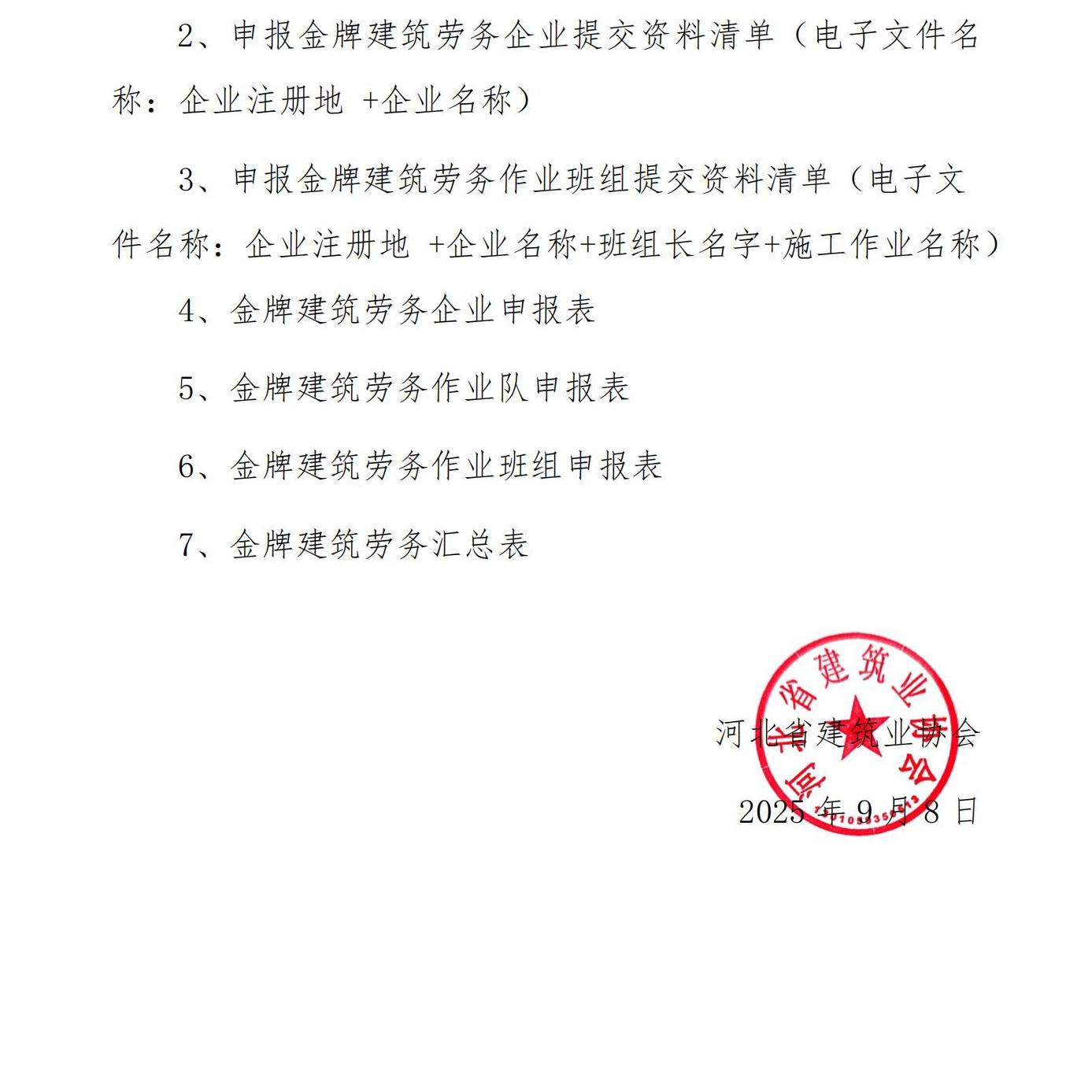 现将河北省建筑业协会下发的《关于开展 2025 年度第二批“燕赵建筑” 金牌建筑劳务企业、作业队和作业班组评价工作的通知》(冀建协字〔2025〕111号)转发给大家,请满足申报条件的企业单位积极申报。