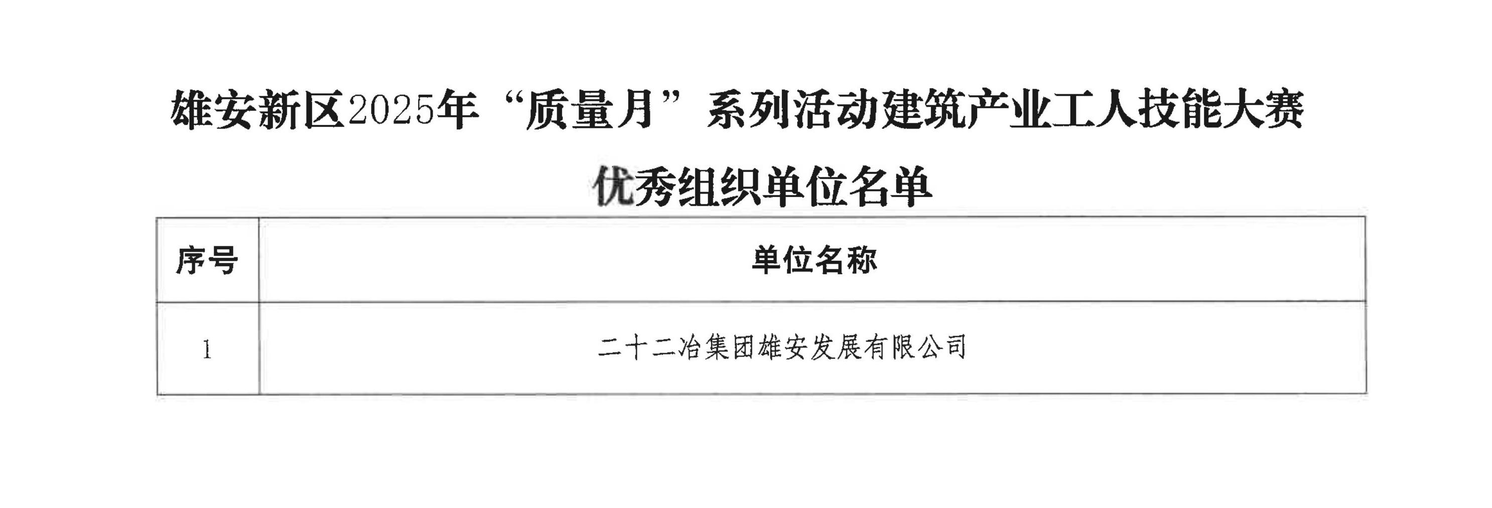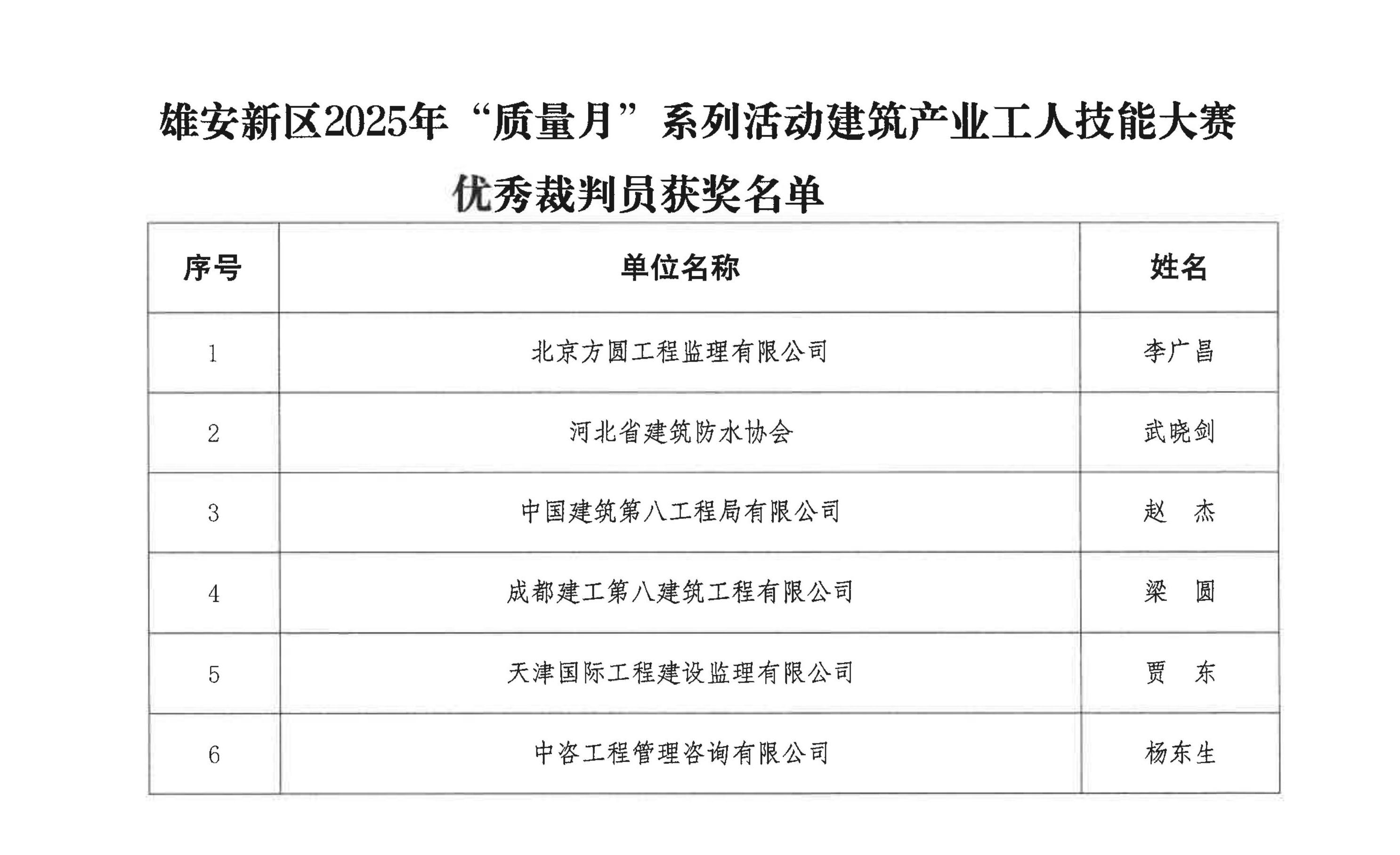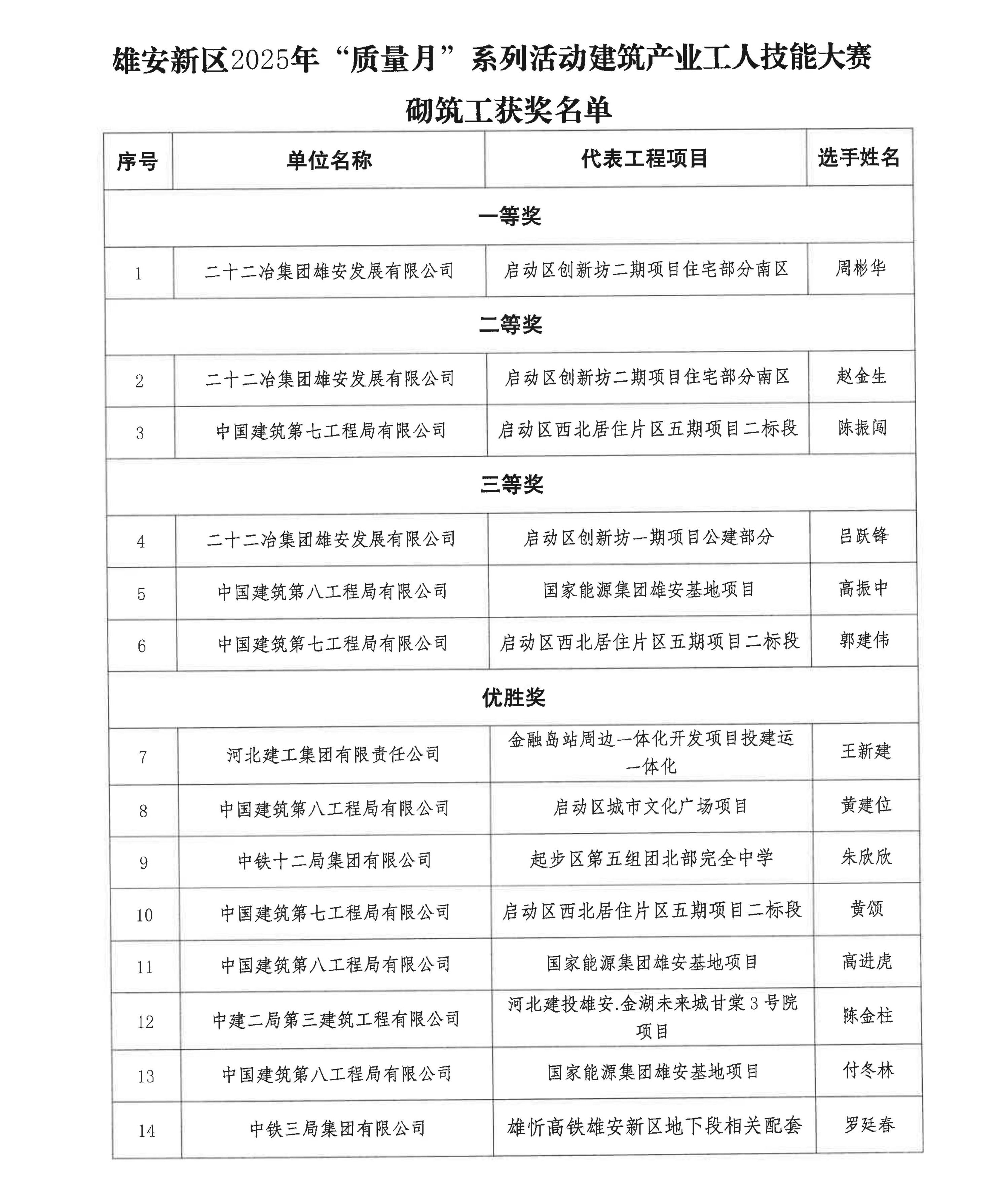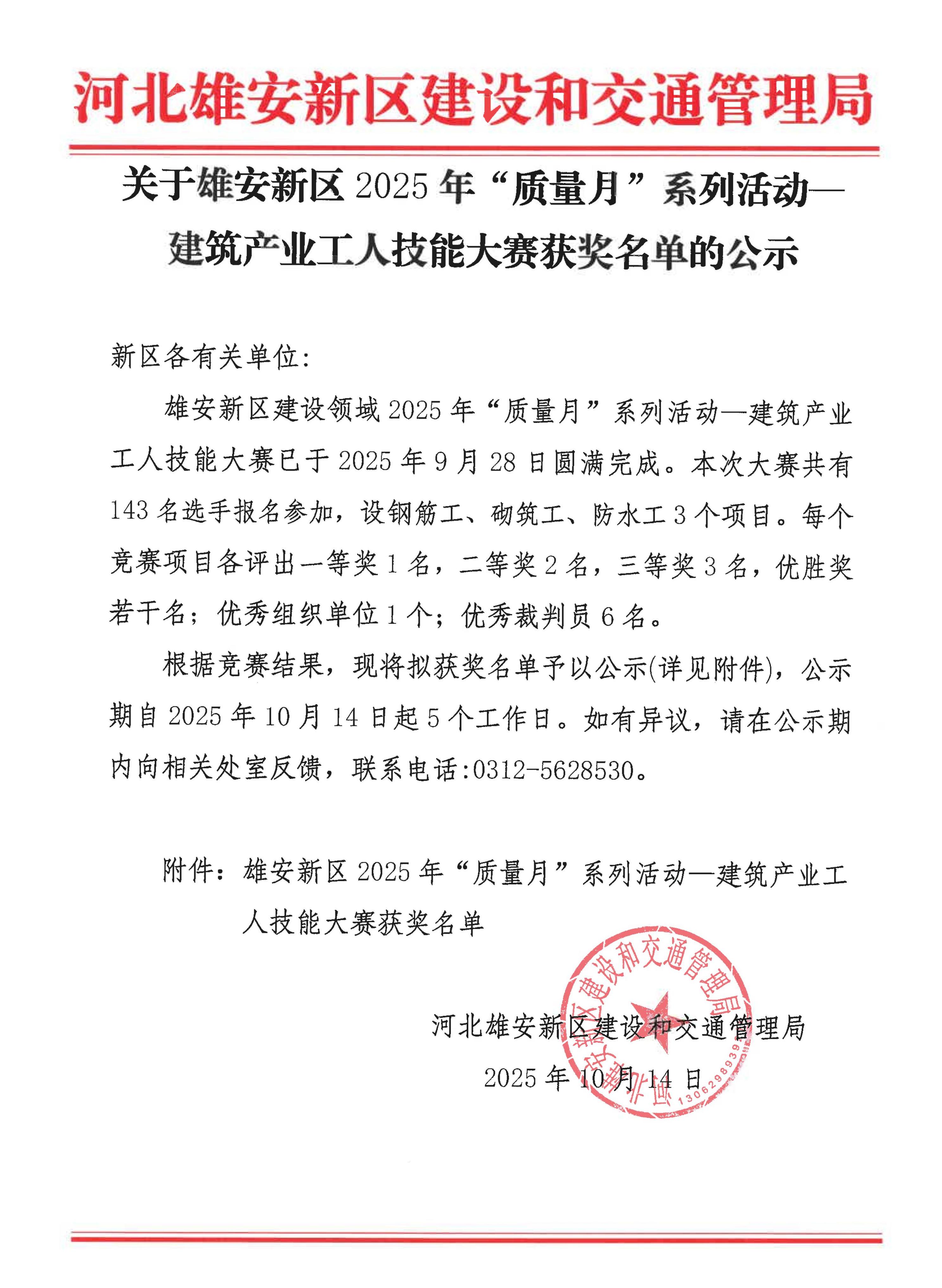 雄安新区建交局《关于雄安新区2025年质量月系列活动——建筑产业工人技能大赛获奖名单的公示》