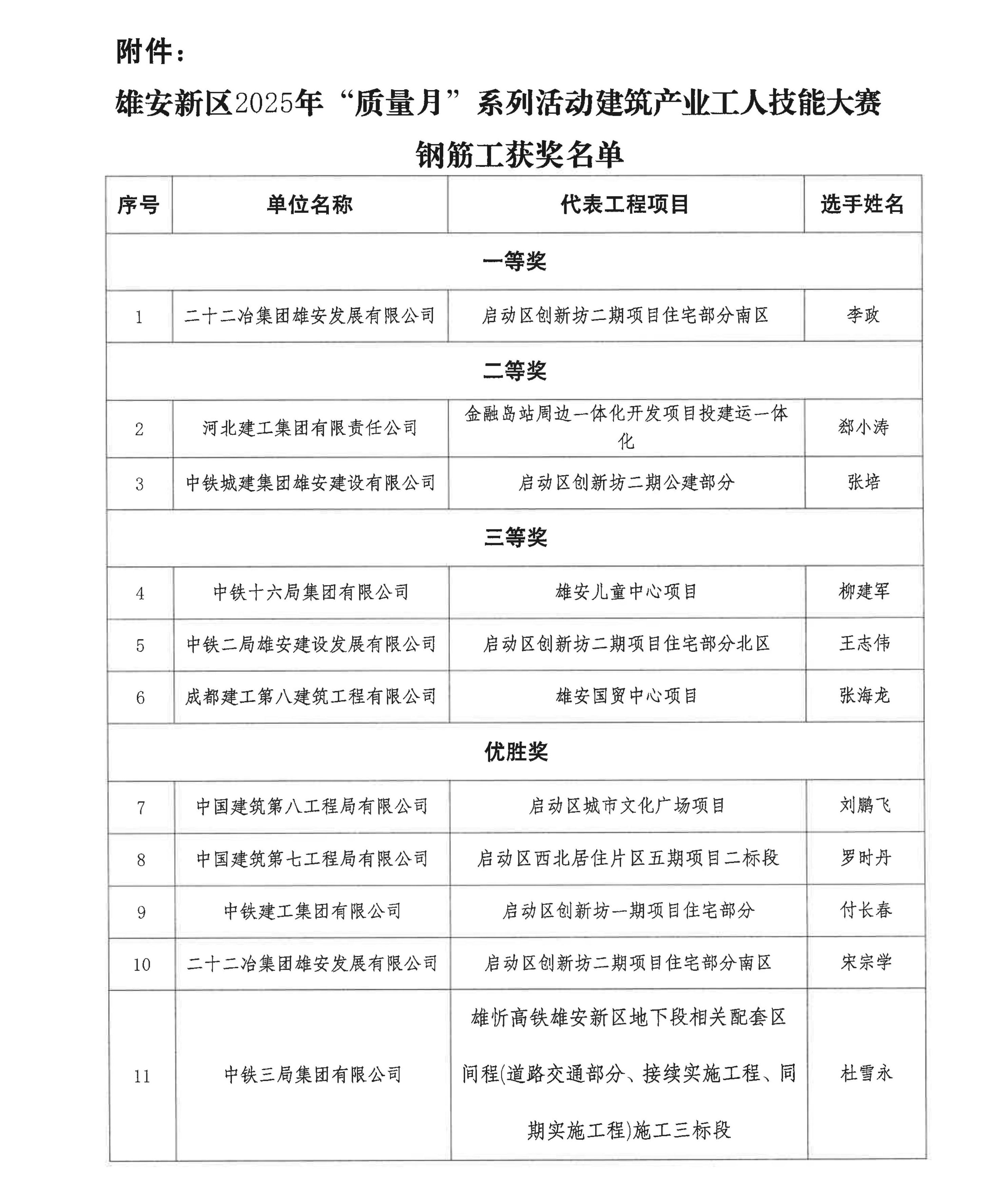 附件:关于雄安新区2025年质量月系列活动——建筑产业工人技能大赛获奖名单的公示