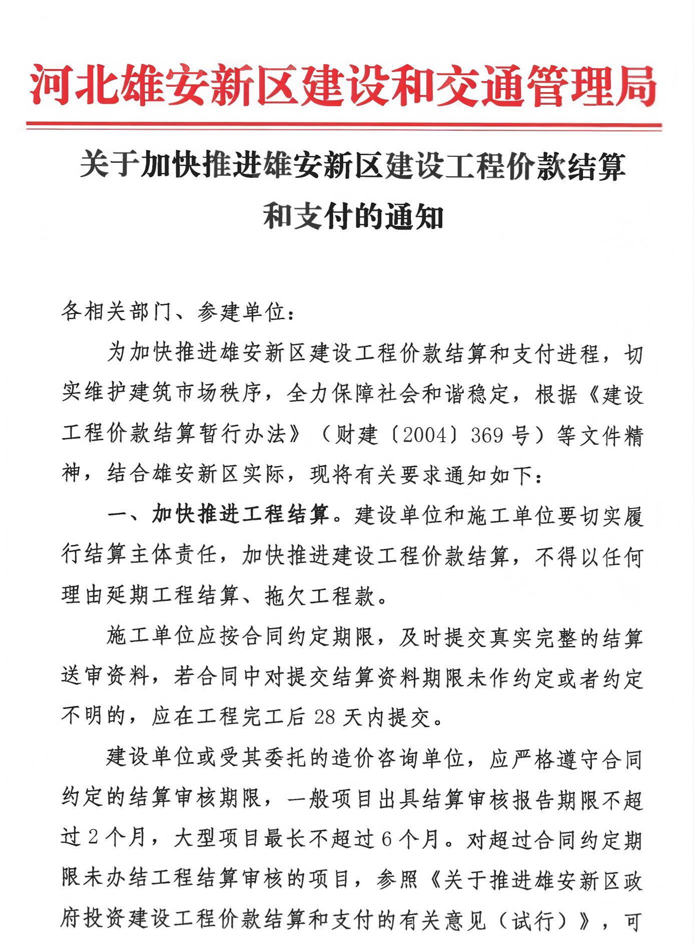 转发建交局《关于加快推进雄安新区建设工程价款结算和支付的通知》