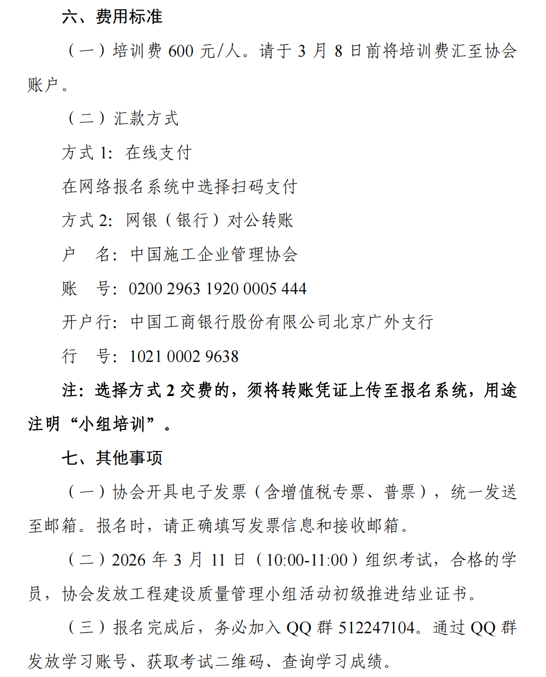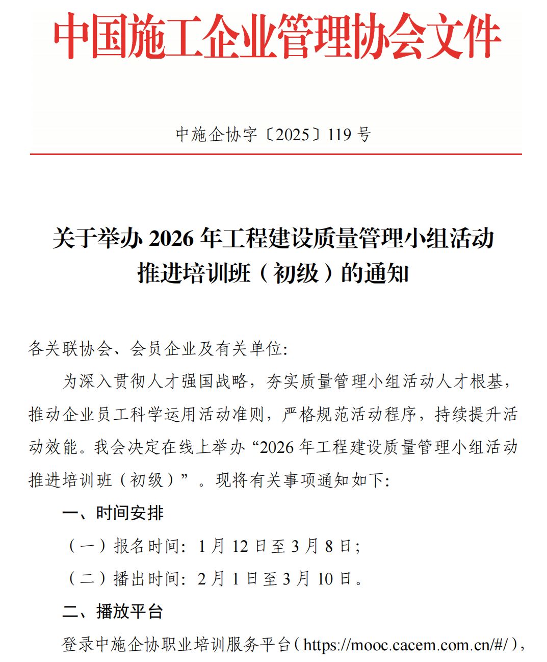 《关于举办2026年工程建设质量管理小组活动推进培训班(初级)的通知》